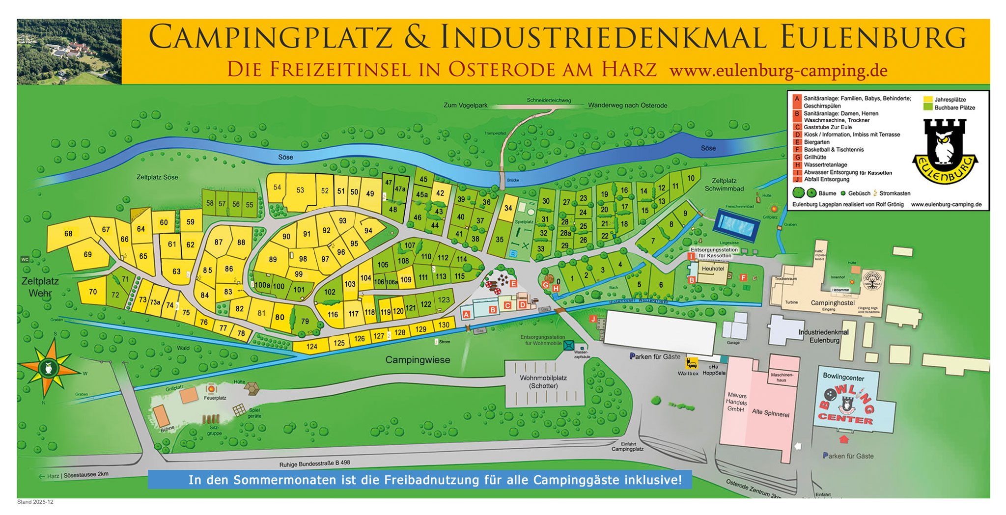 50 Touristen- und 80 Jahresplätze sind parzelliert (80-200 qm) und umgeben von altem Baumbestand, Wiesengrund und Bächen. In dieser schönen Idylle liegen der Wohnmobilplatz mit fachgerechten Ver- und Entsorgungsanlagen sowie unsere Gruppenplätze und das Heulager für "Schlafen im Heu". Auch das finden Sie auf dem Campingplatz: Die gemütliche Gast- und Kaminstube "Zur Eule" mit angeschlossenem Biergarten und Imbiss, zwei Grillhütten, Waschräume für Familien, Babys und Behinderte, ein Wassertretbecken sowie ein Schwimmbad (8 x 20 m) und einen Kinderspielplatz mit Planschbecken. Weitere Informationen und Bilder unter www.eulenburg-camping.de